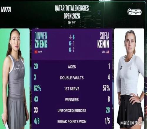 WTA1000多哈站首轮,郑钦文面对前澳网冠军肯宁,在先失一盘的情况下,轰出惊人的20记ACE,以4-6、6-1、6-2逆转取胜,迎来了伤愈复出的赛季开门红。