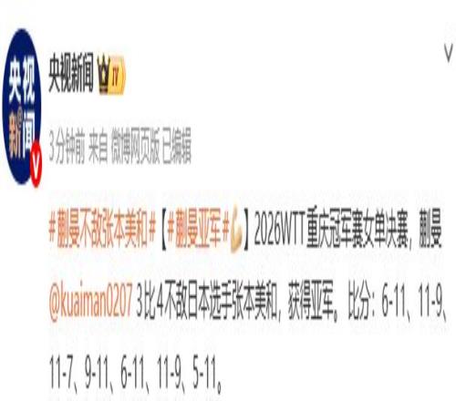 据央视新闻微博消息,2026WTT重庆冠军赛女单决赛,蒯曼3比4不敌日本选手张本美和,获得亚军。 比分:6-11、11-9、11-7、9-11、6-11、11-9、5-11。