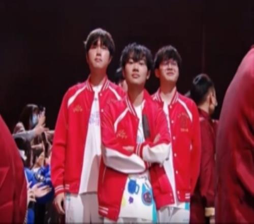 AL对阵BLG登场仪式:双方队员身披红色战袍为观众派发红包
